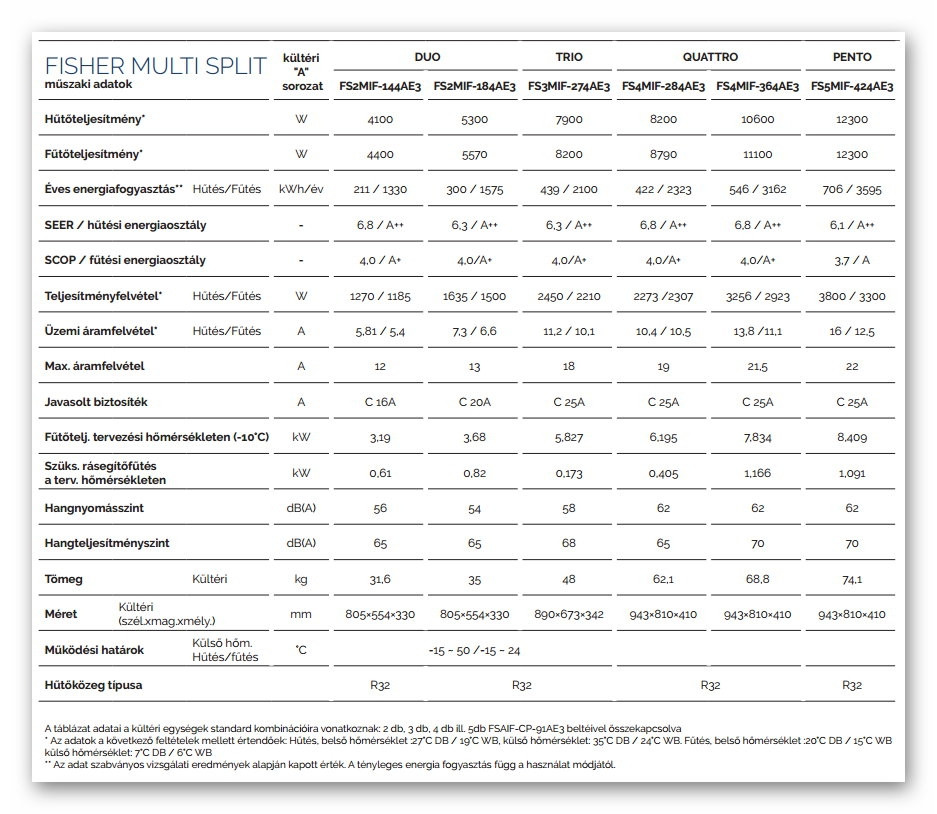 A Fisher FS2MIF-144AE3 Multi klíma kültéri egység (max. 2 beltéri egységhez) fontos tulajdonságai:
